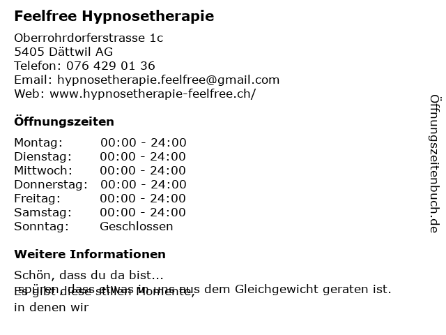 | Öffnungszeiten Feelfree Hypnosetherapie in Dättwil AG anzeigen | |