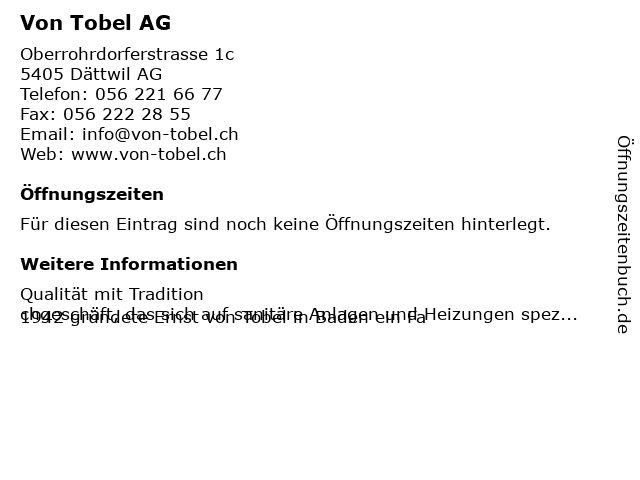 | Öffnungszeiten Von Tobel AG in Dättwil AG anzeigen | |