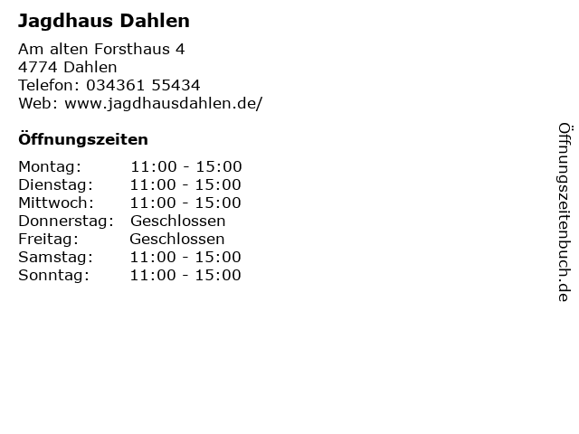 | Öffnungszeiten Jagdhaus Dahlen in Dahlen anzeigen | |