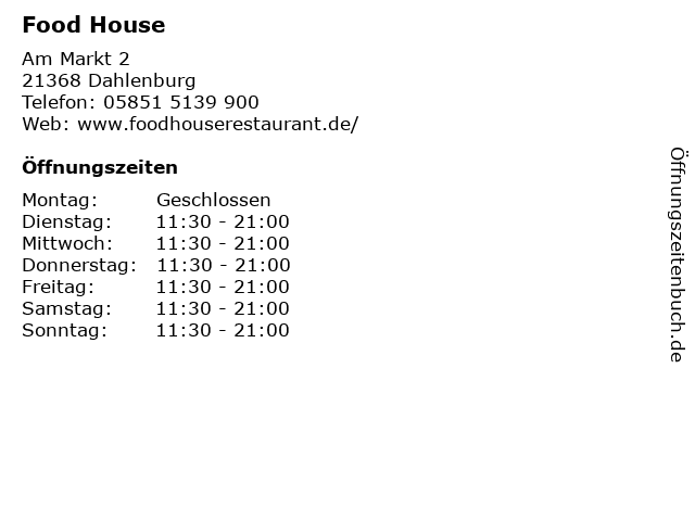 | Öffnungszeiten Food House in Dahlenburg anzeigen | |