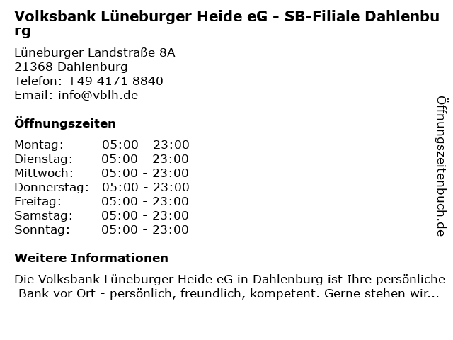 1 Volksbank Lüneburger Heide eG (Geldautomat) (Entfernung: 0,01 km) Lüneburger Landstraße 8, 21368 Dahlenburg 6 |