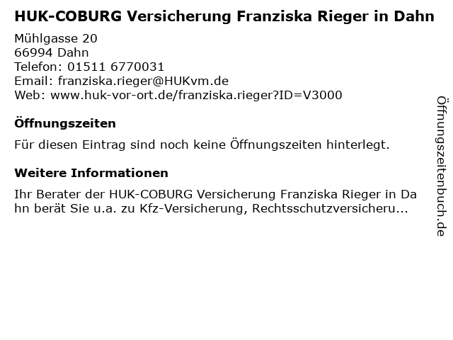 | HUK-COBURG Versicherung Franziska Rieger in Dahn anrufen | |