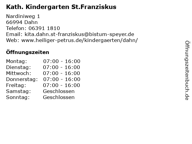 | Öffnungszeiten Kath. Kindergarten St.Franziskus in Dahn anzeigen | |