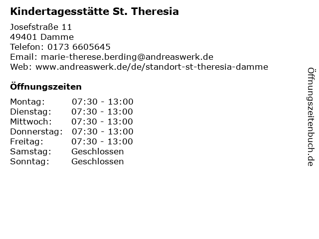 | Öffnungszeiten Kindertagesstätte St. Theresia in Damme anzeigen | |