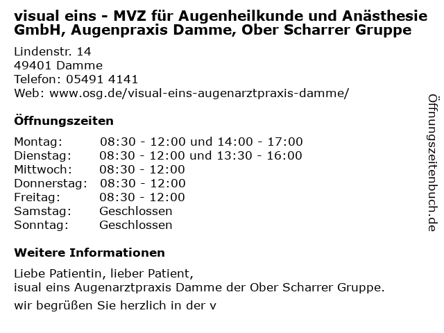 Branchen & Suchbegriffe zu visual eins - MVZ für Augenheilkunde und Anästhesie GmbH, Augenpraxis Damme, Ober Scharrer Gruppe:anästhesie, augenheilkunde, augenpraxis, damme, eins, gruppe, mvz, ober, scharrer, visual |