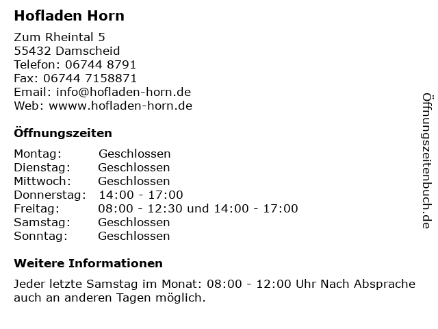 | Öffnungszeiten Hofladen Horn in Damscheid anzeigen | |