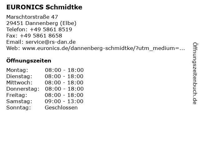 | Öffnungszeiten EURONICS Schmidtke in Dannenberg (Elbe) anzeigen | |