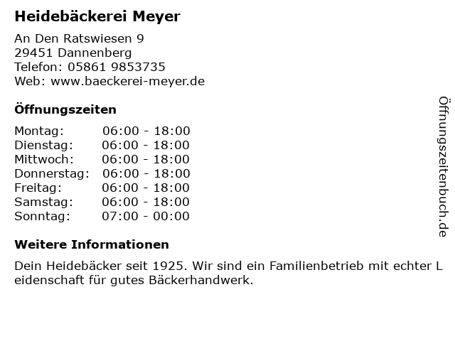| Öffnungszeiten Heidebäckerei Meyer in Dannenberg anzeigen | |