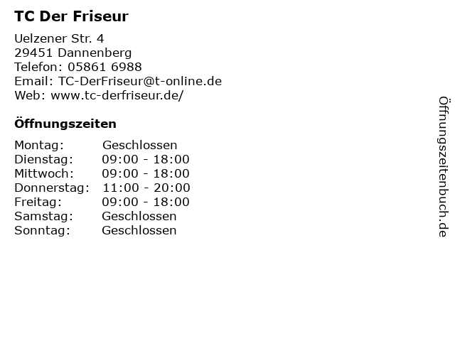 | Öffnungszeiten TC Der Friseur in Dannenberg anzeigen | |