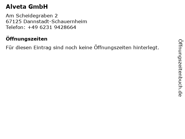 | Öffnungszeiten Alveta GmbH in Dannstadt-Schauernheim anzeigen | |