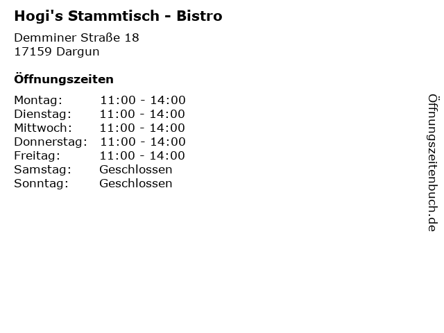 | Öffnungszeiten Hogi's Stammtisch - Bistro in Dargun anzeigen | |