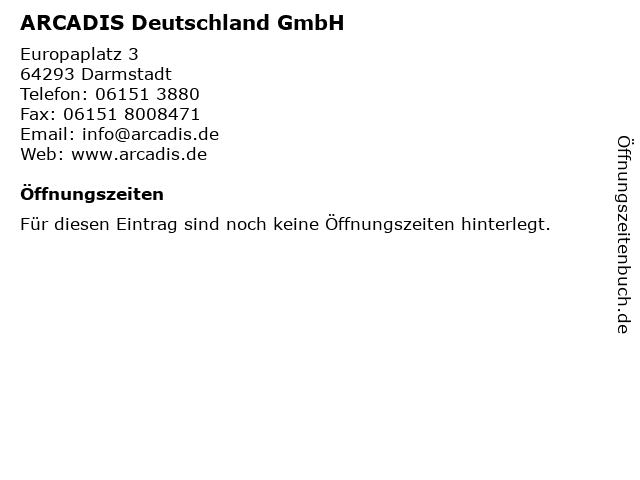 | Öffnungszeiten ARCADIS Deutschland GmbH in Darmstadt anzeigen | |