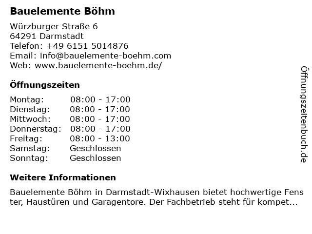 | Öffnungszeiten Bauelemente Böhm in Darmstadt anzeigen | |