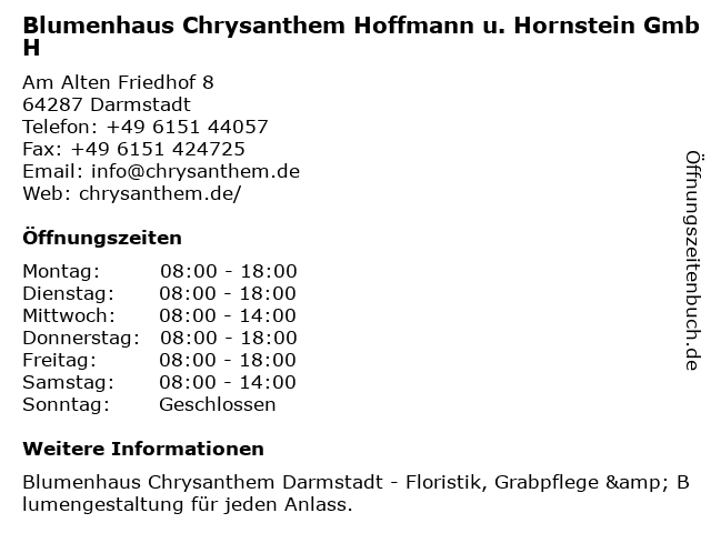 | 2 Blumenhaus Chrysanthem Meisterflorist am Prinz Emil Garten (Entfernung: 1,55 km) Heidelberger Straße 62, 64285 Darmstadt 6 |