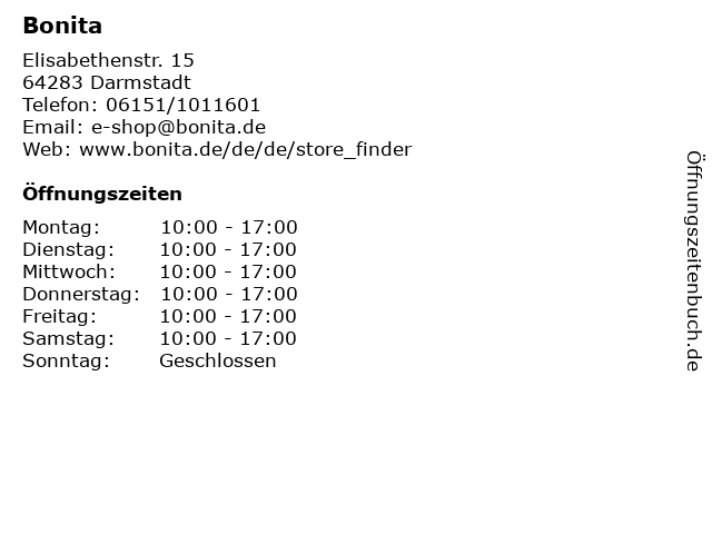 | Öffnungszeiten Bonita in Darmstadt anzeigen | |