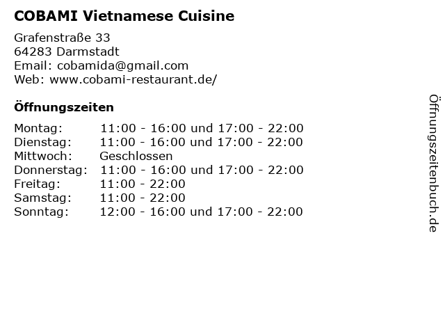 | Öffnungszeiten COBAMI Vietnamese Cuisine in Darmstadt anzeigen | |