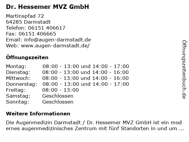 | Öffnungszeiten Dr. Hessemer MVZ GmbH in Darmstadt anzeigen | |