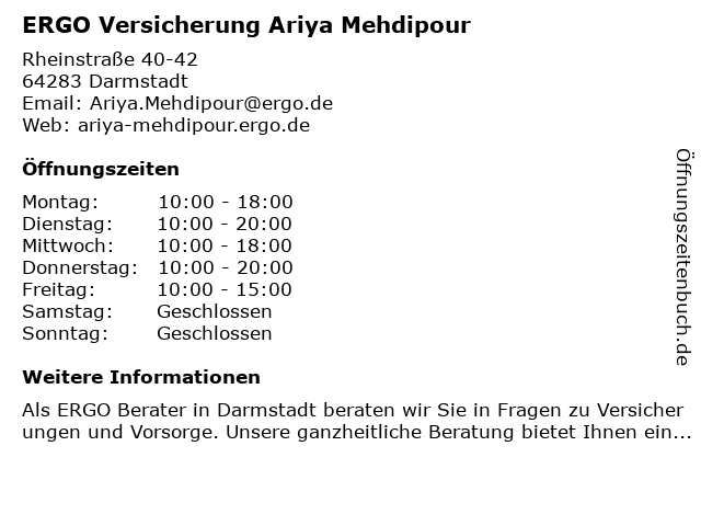 | Öffnungszeiten ERGO Versicherung Ariya Mehdipour in Darmstadt anzeigen | |