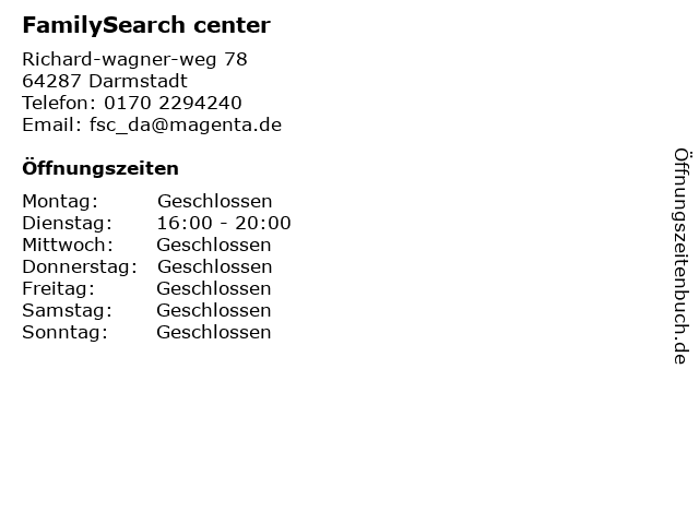 | Öffnungszeiten FamilySearch center in Darmstadt anzeigen | |