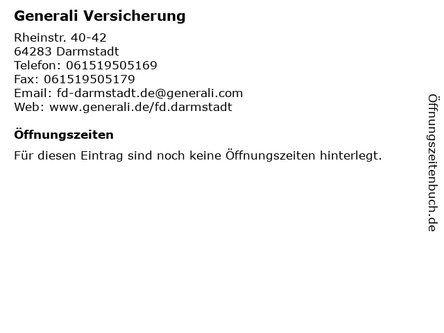 | Öffnungszeiten Generali Versicherung in Darmstadt anzeigen | |