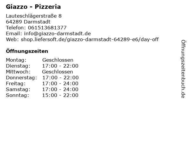 | Öffnungszeiten Giazzo - Pizzeria in Darmstadt anzeigen | |