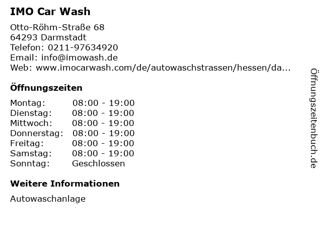| Öffnungszeiten IMO Car Wash in Darmstadt anzeigen | |