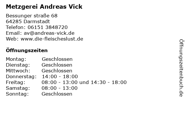 | Öffnungszeiten Metzgerei Andreas Vick in Darmstadt anzeigen | |
