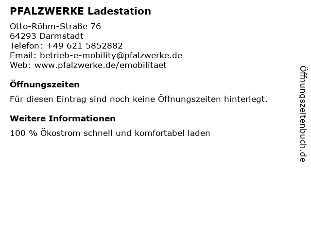 | Öffnungszeiten PFALZWERKE Ladestation in Darmstadt anzeigen | |