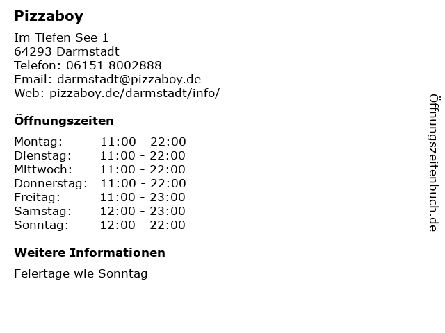 | Öffnungszeiten Pizzaboy in Darmstadt anzeigen | |