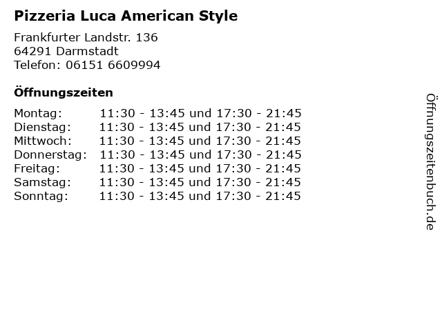 | Öffnungszeiten Pizzeria Luca in Darmstadt anzeigen | |