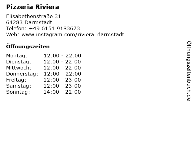 | Öffnungszeiten Pizzeria Riviera in Darmstadt anzeigen | |