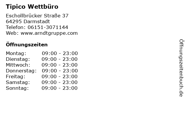 | Öffnungszeiten Tipico Wettbüro in Darmstadt anzeigen | |