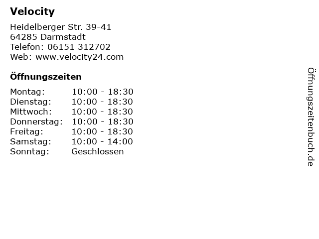 | Öffnungszeiten Velocity in Darmstadt anzeigen | |