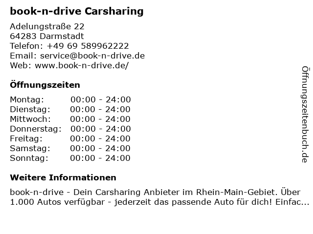 | Öffnungszeiten book-n-drive Carsharing in Darmstadt anzeigen | |
