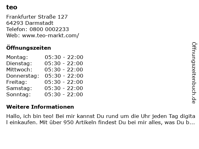 | Öffnungszeiten teo in Darmstadt anzeigen | |