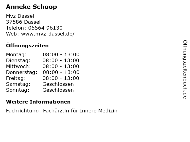 | Öffnungszeiten Anneke Schoop in Dassel anzeigen | |