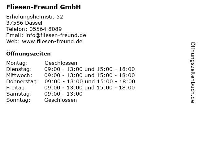 | Öffnungszeiten Fliesen-Freund GmbH in Dassel anzeigen | |