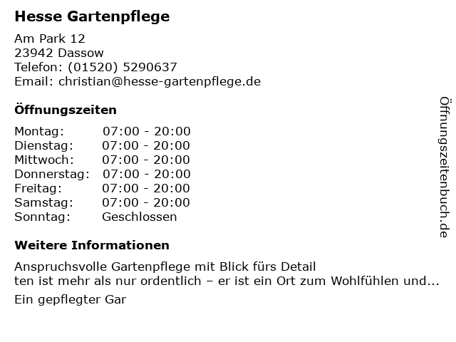 | Öffnungszeiten Hesse Gartenpflege in Dassow anzeigen | |