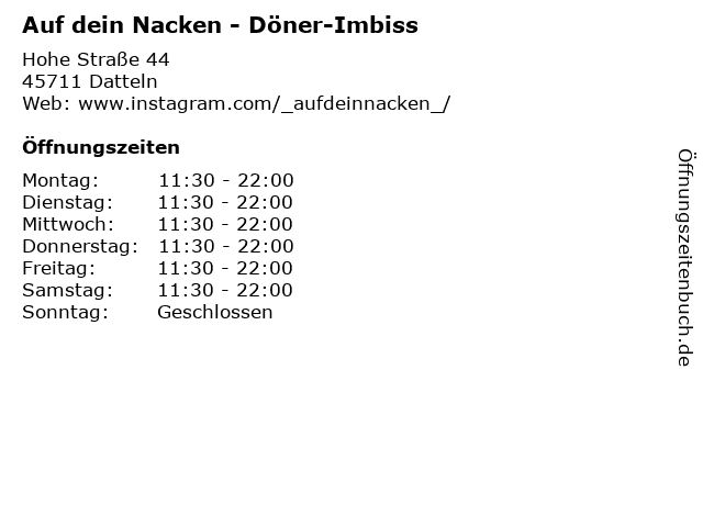 | Öffnungszeiten Auf dein Nacken - Döner-Imbiss in Datteln anzeigen | |