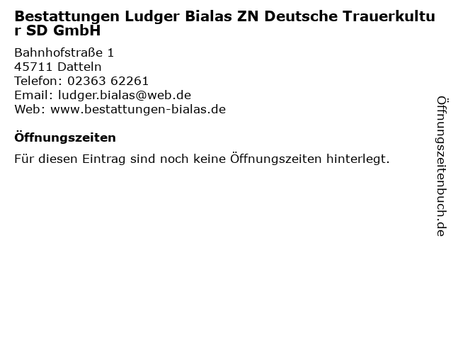 | Bestattungen Ludger Bialas ZN Deutsche Trauerkultur SD GmbH anrufen | |