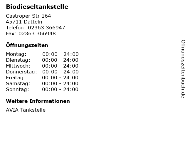 | Öffnungszeiten Biodieseltankstelle in Datteln anzeigen | |