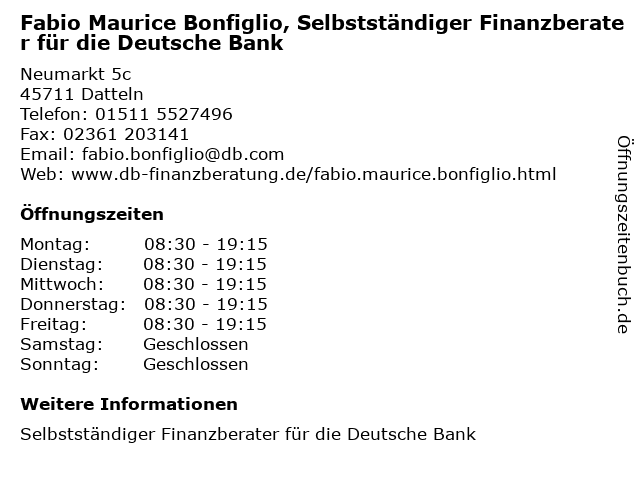 2 Oliver Heck, Selbstständiger Finanzberater für die Deutsche Bank (Entfernung: 0,00 km) Neumarkt 5c, 45711 Datteln 4 unabhaengiger-finanzberater.de - ein Projekt der Incofin GmbH & Co. KG (Entfernung: 12,01 km) Tiroler Straße 4-6, 45659 Recklinghausen 6 |
