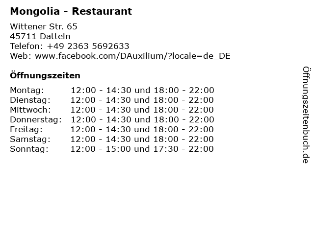 | Öffnungszeiten Mongolia - Restaurant in Datteln anzeigen | |