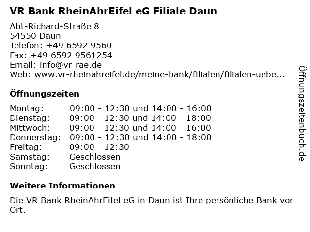 2 VR Bank RheinAhrEifel eG, SB Filiale Oberstadtfeld (Entfernung: 4,71 km) Üdersdorfer Straße 3A, 54570 Oberstadtfeld 3 VR Bank RheinAhrEifel eG Filiale Gillenfeld (Entfernung: 9,39 km) Pulvermaarstraße 2, 54558 Gillenfeld 6 Volksbank RheinAhrEifel eG, SB Filiale Center Parcs Park Eifel (Entfernung: 12,39 km) Am Kurberg 10, 56767 Gunderath |
