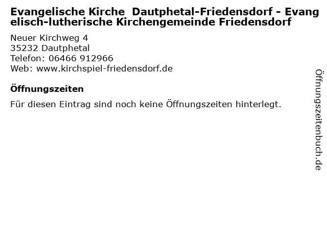 | Evangelische Kirche Dautphetal-Friedensdorf - Evangelisch-lutherische Kirchengemeinde Friedensdorf anrufen | |