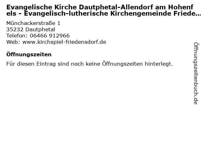 | Evangelische Kirche Dautphetal-Allendorf am Hohenfels - Evangelisch-lutherische Kirchengemeinde Friedensdorf anrufen | |