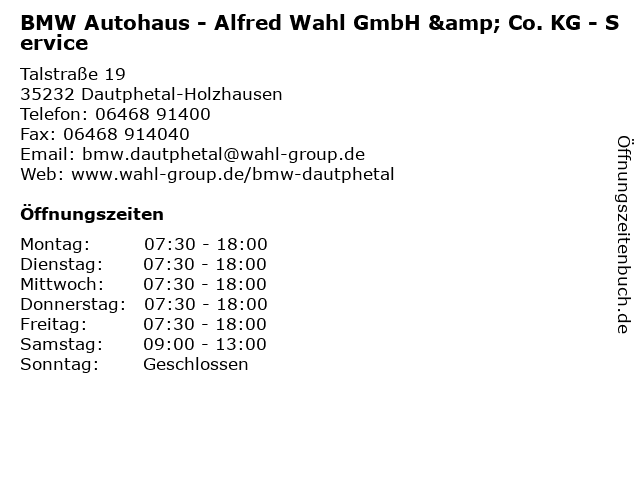 1 BMW Autohaus - Alfred Wahl GmbH & Co. KG - Verkauf (Entfernung: 0,00 km) Talstraße 19, 35232 Dautphetal-Holzhausen 2 BMW Autohaus - Alfred Wahl GmbH & Co. KG - Teile und Zubehör (Entfernung: 0,00 km) Talstraße 19, 35232 Dautphetal-Holzhausen 3 Johannes Clemens und Judith Bösser Zweigstelle der Kleintierpraxis Aartalsee (Entfernung: 0,45 km) Unter der Linde 8, 35232 Dautphetal 6 |