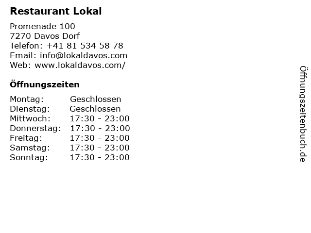| Telefonnummer Restaurant Lokal in Davos Dorf (+41 81 534 58 78) anrufen | |