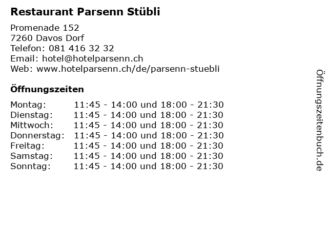 | Öffnungszeiten Restaurant Parsenn Stübli in Davos Dorf anzeigen | |