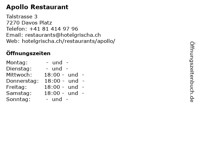 | Öffnungszeiten Apollo Restaurant in Davos Platz anzeigen | |